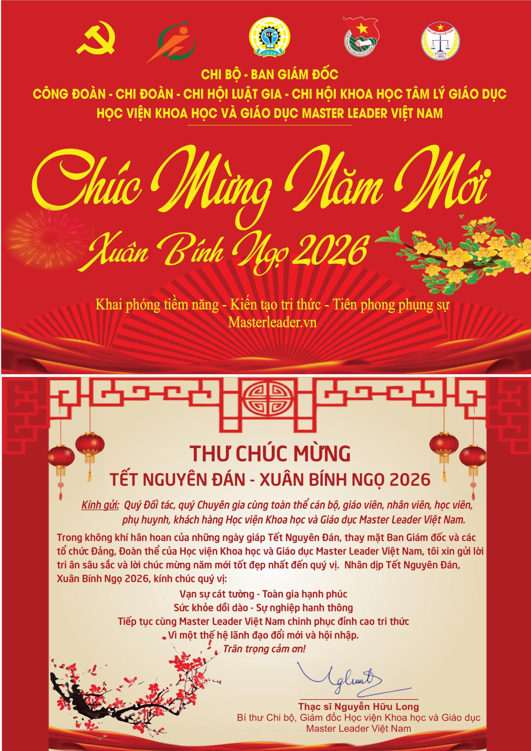 - Tổ chức thành công Lễ ra mắt tổ chức Đảng, Đoàn thể và kí hợp tác hoạt động y tế, giáo dục giữa Master Leader Việt Nam và MEDLATEC Quảng Bình giai đoạn 2024-2029.