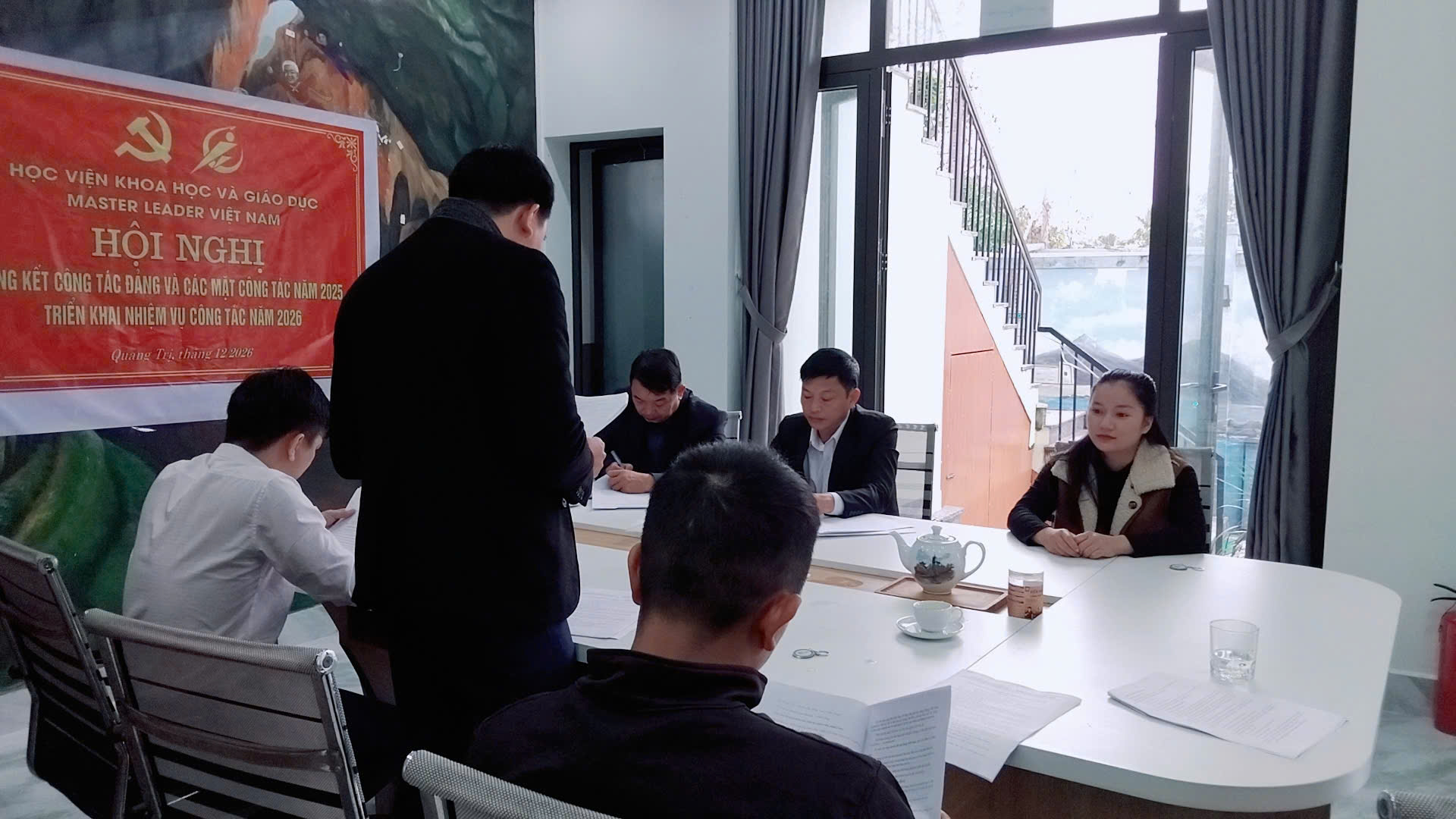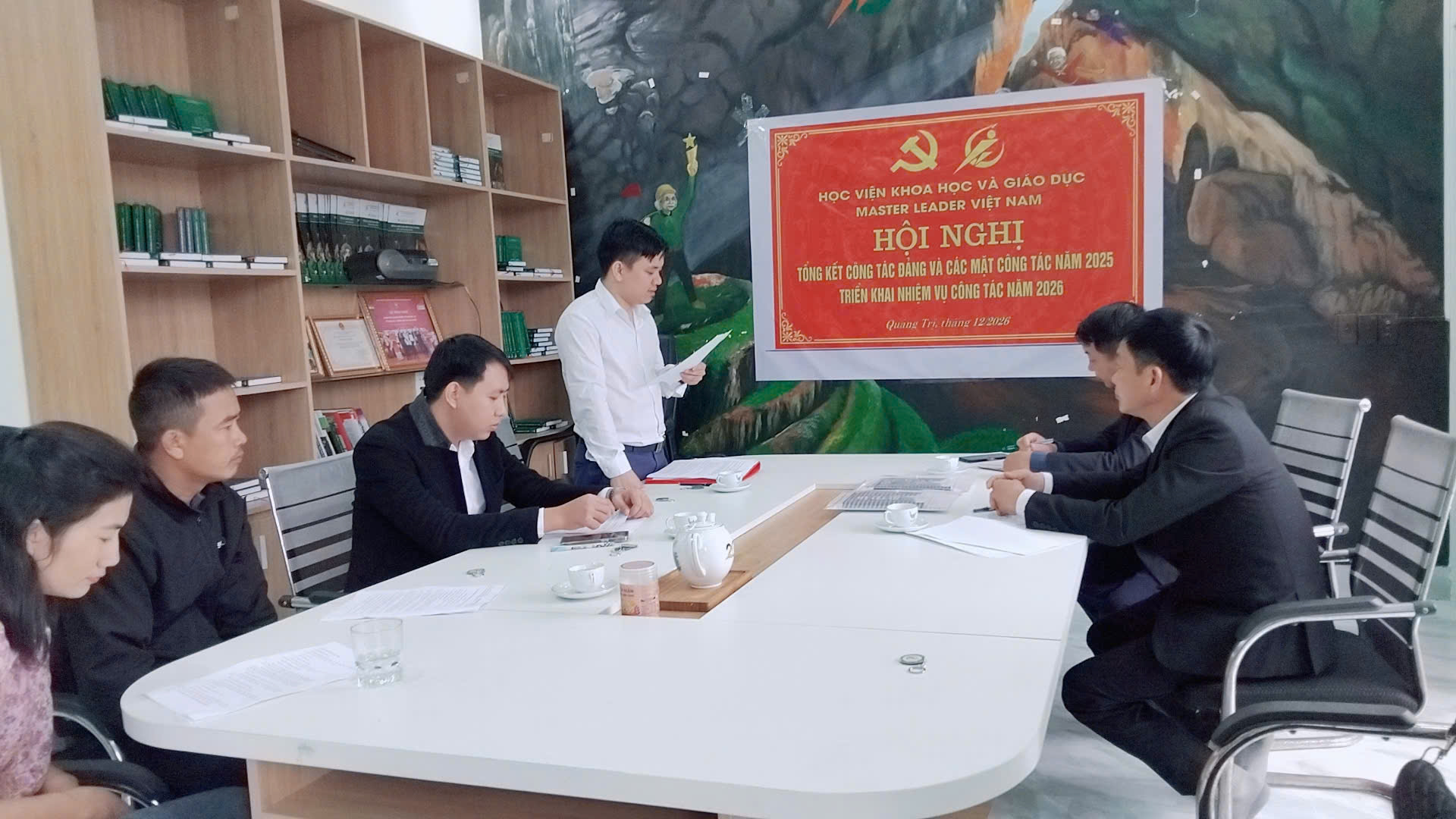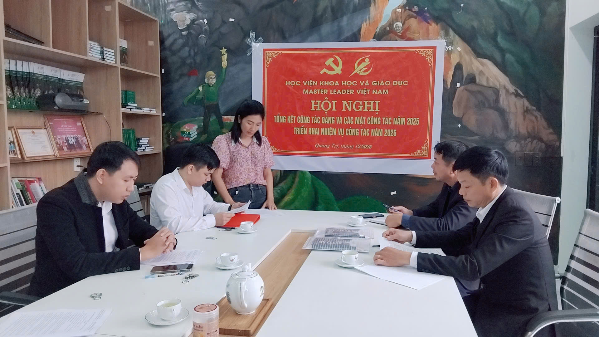 Ngày 10/12/2025, Chi bộ phối hợp với Ban Giám đốc Học viện Khoa học và Giáo dục Master Leader Việt Nam đã long trọng tổ chức Hội nghị Tổng kết công tác Đảng và các mặt năm 2025, triển khai nhiệm vụ năm 2026. Hội nghị có sự tham dự của đại diện Đảng uỷ xã Quảng Ninh, tỉnh Quảng Trị, Đảng viên Chi bộ, Đại diện Ban Giám đốc, Văn phòng Đảng, Đoàn thể và Hành chính và đại diện các tổ chức Đoàn thể của Học viện. Đồng chí Nguyễn Hữu Long, Bí thư Chi bộ, Giám đốc chù trì Hội nghị.